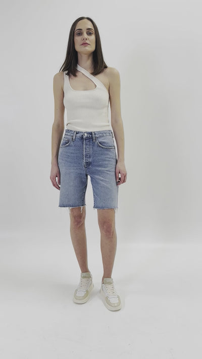 Vaba lõikega lühikesed teksapüksid kulunud allääre ja vintage-efektiga.