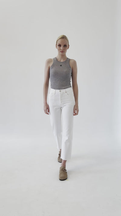 Widely cut jeans that create a flattering straight silhouette. They feature slight distressed effect, fringed bottom hems, five pockets, and button fastening on the front.